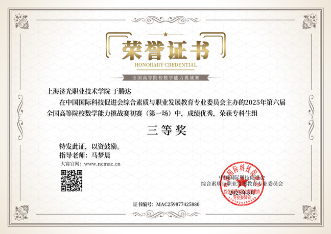 基础部高数教研室对此次竞赛非常重视,在马梦晨老师的赛前辅导下,多位学生在初赛中表现优异,2024级计算机网络技术专业黎朝阳获得上海赛区二等奖、2024级建筑智能化工程技术专业于腾达获得上海赛区三等奖,两位同学顺利闯进全国总决赛。