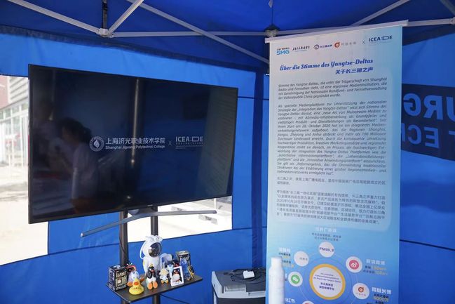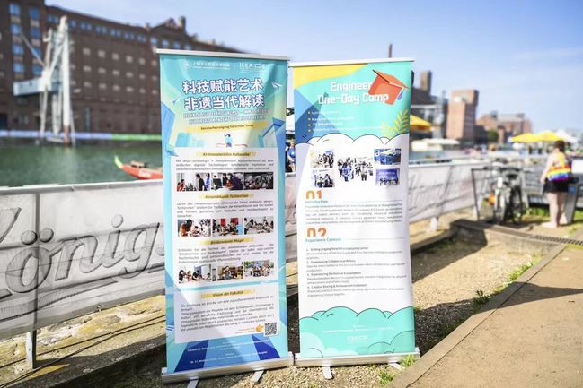 活动秉持守正创新,跨界共融理念,匠心策划沉浸式文化体验矩阵:长三角之声主持人江冉领衔的青少年古诗诵读环节,以声韵为桥展现中华诗词的永恒魅力;星探官团队通过写中国字·唱中国歌等互动场景,让水墨丹青与现代旋律在莱茵河畔激荡出文化自信的强音。这场跨越时空的文明对话,生动诠释了中华文化既赓续千年文脉、又拥抱时代浪潮的蓬勃生命力。上海济光职业技术学院设计创意学院系列非遗技艺体验活动的展板也陈列其中,并吸引了大量德国孩子的目光。从黄浦江到莱茵河,从AI工坊到龙舟赛场,师生们正以创新之笔,传播中华文明的瑰宝。