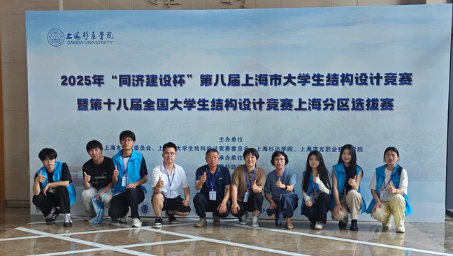 7月7日至9日,2025年“同济建设杯”第八届上海市大学生结构设计竞赛暨第十八届全国大学生结构设计竞赛上海分区选拔赛在上海杉达学院举行。本届竞赛由上海杉达学院和我校联合主办,共有来自同济大学、上海交通大学等上海11所高校22支队伍同台竞技,我校建筑工程学院2支赛队参赛,我校是唯一一所参赛的高职院校,也是首次参赛。我校姜富明书记、孙遥副校长分别在开幕式和闭幕式上致辞,建筑工程学院曹吉鸣院长、葛东霞副院长参加了大赛的开幕式和闭幕式。经过激烈的角逐,我校建筑工程学院学生喜获三等奖、优胜奖的好成绩。