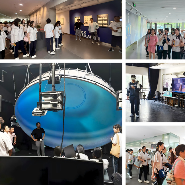 紧接着,师生们走进同济大学艺术与传媒学院多个高规格实验室与工作室,实地感受“艺术+科技”的教学与实践氛围。在XR演播实验室,大家在黄岱颖老师的指导下体验大空间VR游戏作品,在虚拟与现实交织的世界中感受沉浸叙事的魅力;球幕实验室中,360度环绕视听系统营造出极具冲击力的感官体验,呈现了新媒体艺术在展演、科普等领域的广泛应用;在动画工作室,学生自主研发的VR游戏作品成为焦点,戴上设备的那一刻,奇幻场景扑面而来,技术的魔力变得可触可感。