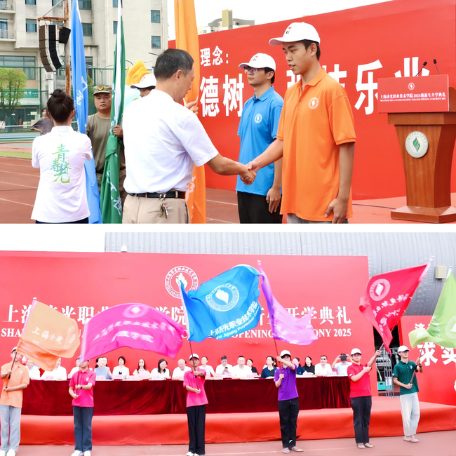 校党委书记姜富明向新生代表授校旗和各二级学院院旗。旗帜飘扬,传承的是济光人的使命与荣光,寄托的是对新一代济光人的殷切期望。