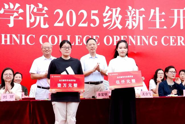 典礼上,校长贺鹏飞、校党委书记姜富明为成功升入本科院校的2025届毕业生代表颁发了“全日制专升本奖学金”,激励新生以学长学姐为榜样,在求学路上坚定前行。