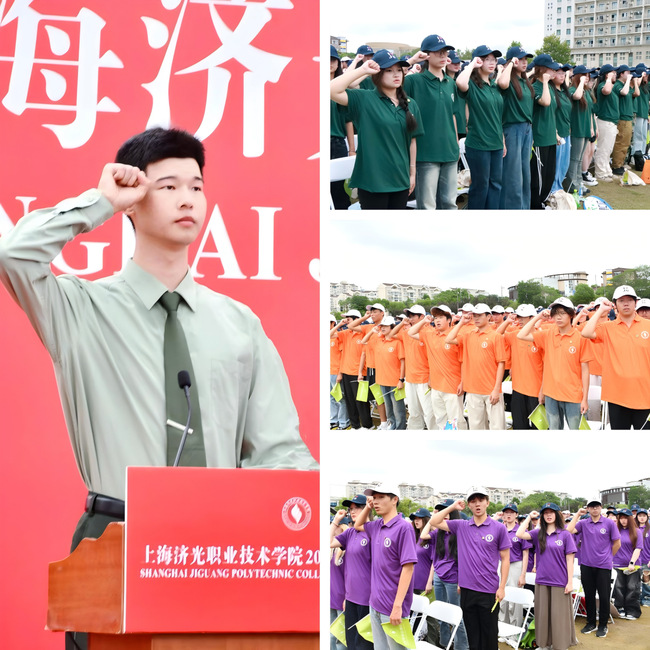 全体新生宣誓环节将典礼推向高潮。在老生代表沈泽圆的领誓下,2025级新生庄严宣誓,铿锵誓言展现了新济光人的壮志豪情。