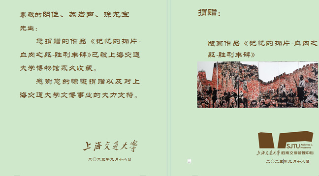 致敬抗战胜利80周年 设计创意学院院长阴佳教授版画作品入藏交大博物馆