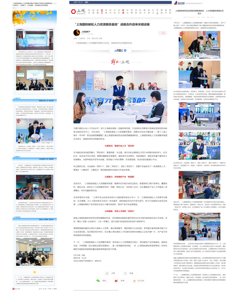近日,我校在邮轮人才培育领域备受瞩目。10 月 27 日,上观新闻客户端、东方网客户端、宝山区人社局微信公众号纷纷报道,上海国际邮轮人力资源服务联盟正式成立,首届师资培训班在我校顺利举办。作为 “上海国际邮轮人力资源服务基地” 战略合作首发项目的举办地,我校见证了一系列重要成果:第十三届上海市 “中华杯” 职业技能竞赛暨第二届上海国际邮轮职业技能竞赛圆满收官,上海国际邮轮人力资源服务联盟宣告成立,首届师资培训班顺利结业。
