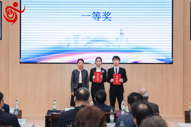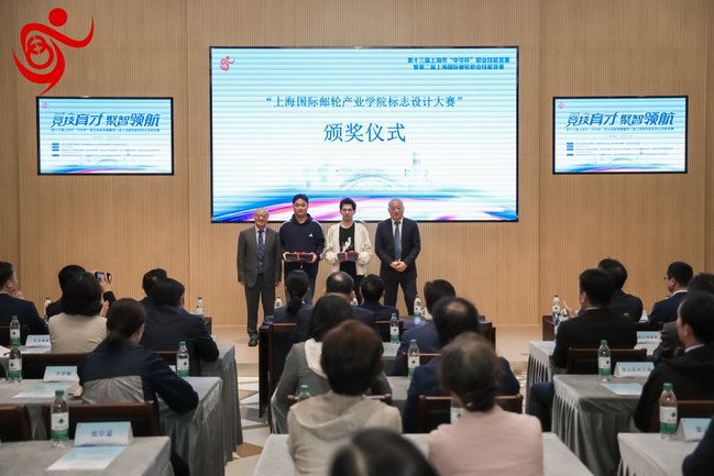 ▲贺鹏飞校长、杨峥总经理共同为上海国际邮轮产业学院标志设计大赛颁奖