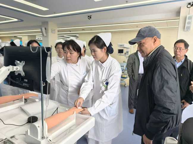 外宾在贺鹏飞校长陪同下参观校园核心教学实训场所。在护理虚拟仿真实训基地,现场观摩了仿真护理操作与应急处理训练演示,对虚实结合的教学模式给予高度评价;走访了建工实训基地及绿色建筑中心,前沿的绿色建筑技术与实践教学体系给对方留下深刻印象。