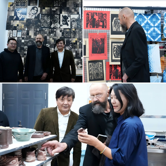 本次活动分为三个环节。在参观设创学院的艺术教学设施环节,阴佳院长陪同沃尔夫教授参观了陶艺、蜡染扎染、版画、布艺贴以及装裱等实训空间,王云霞老师向德国教授赠送了她亲自设计并刚刚烧制完成的陶艺器皿。