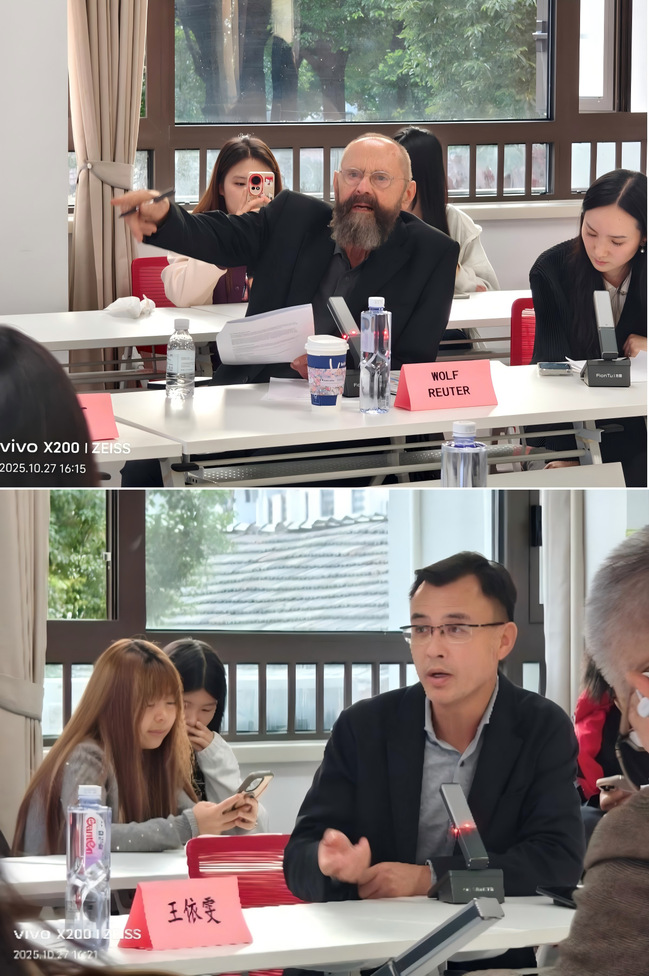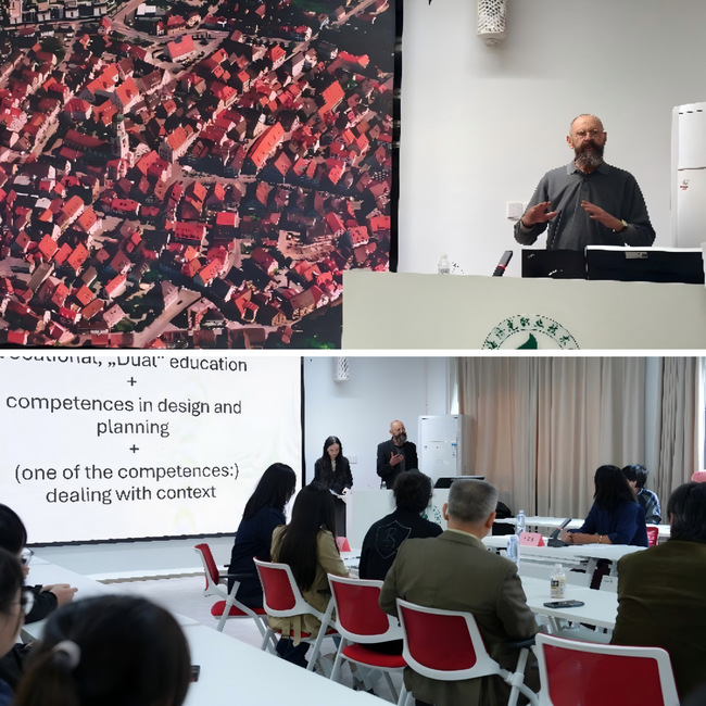 在主题讲座环节,沃尔夫教授以《德国技术教育漫谈》为题,围绕三部分内容展开:对德国“双元制”教育的一些思考;关于设计师应具备的的知识和能力;关于将“处理项目环境关系”作为一项能力。在讲座中,他结合斯图加特大学建筑学科的教学实例,指出课程设置与行业需求深度对接、学生全程参与真实项目、校企协同评定成果等关键机制,形成“理论—实践—反馈”的教学闭环,从而培养兼具专业素养与实操能力的复合型人才。沃尔夫教授特别强调设计的“文脉属性”。他表示:“无论是建筑还是环境装置,脱离地域历史、文化与生态脉络的作品,难以引发深层的价值认同。”
