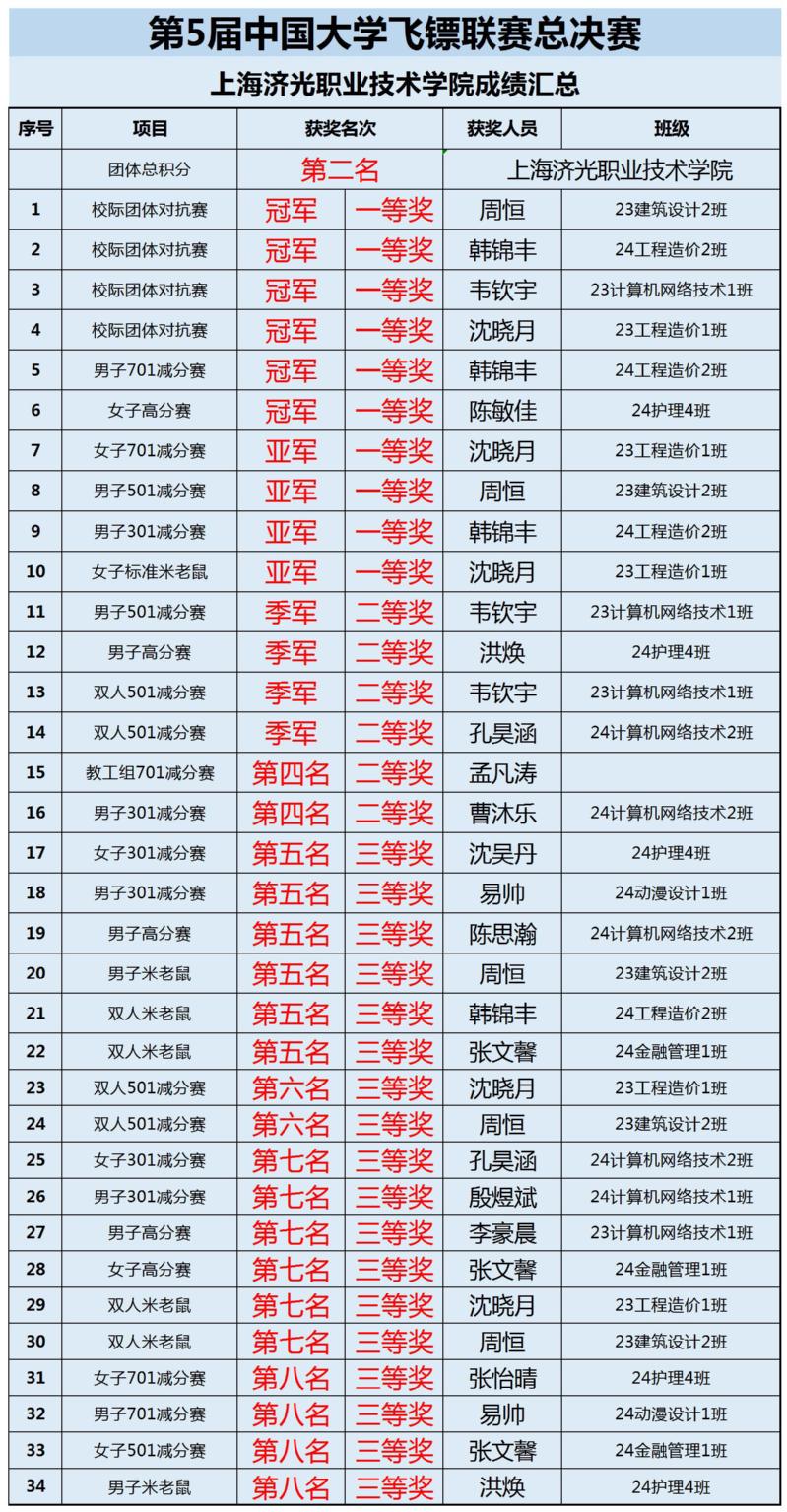 最终,我校飞镖队取得了傲人的成绩:17名参赛队员共计34人次获奖,其中冠军3项,6人次;亚军4项,4人次;季军3项,4人次,我校的总积分居第二名。