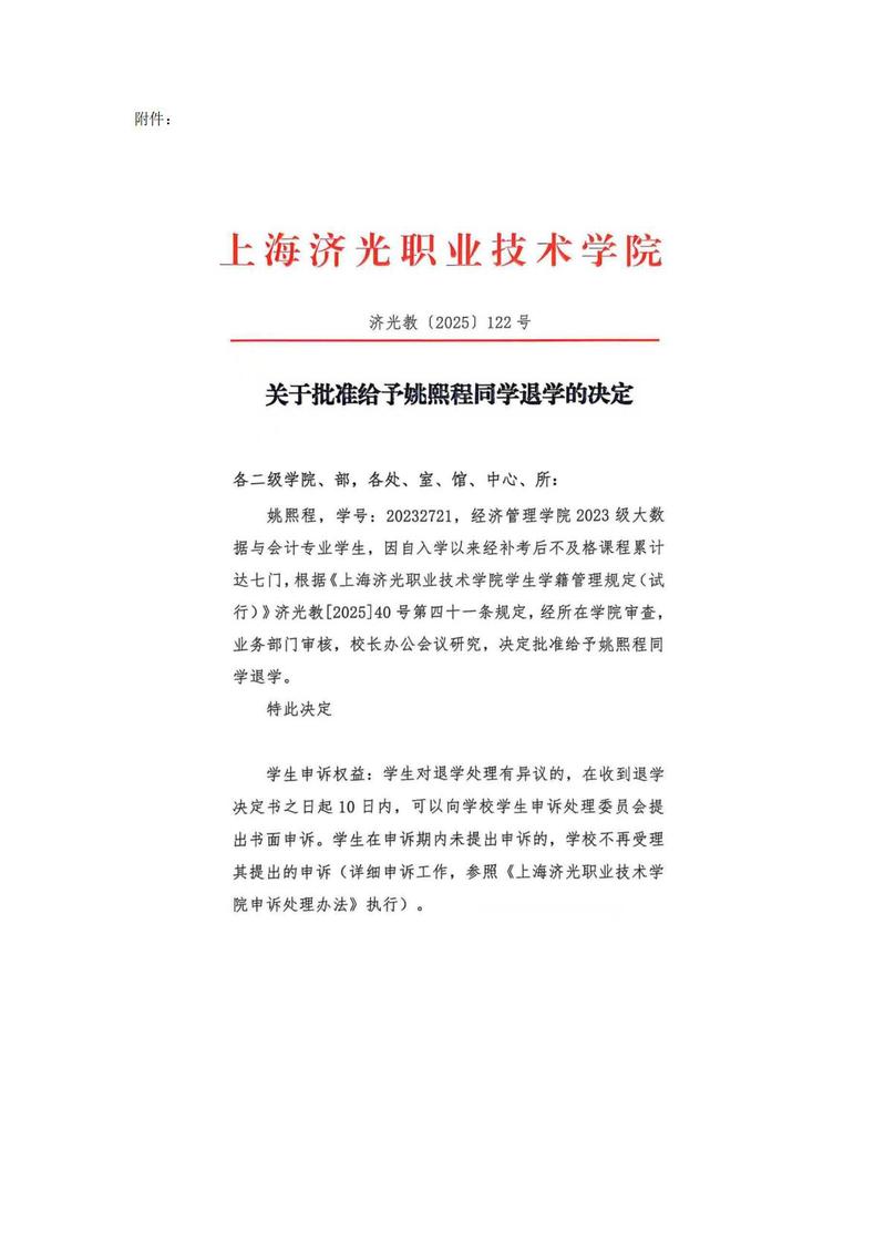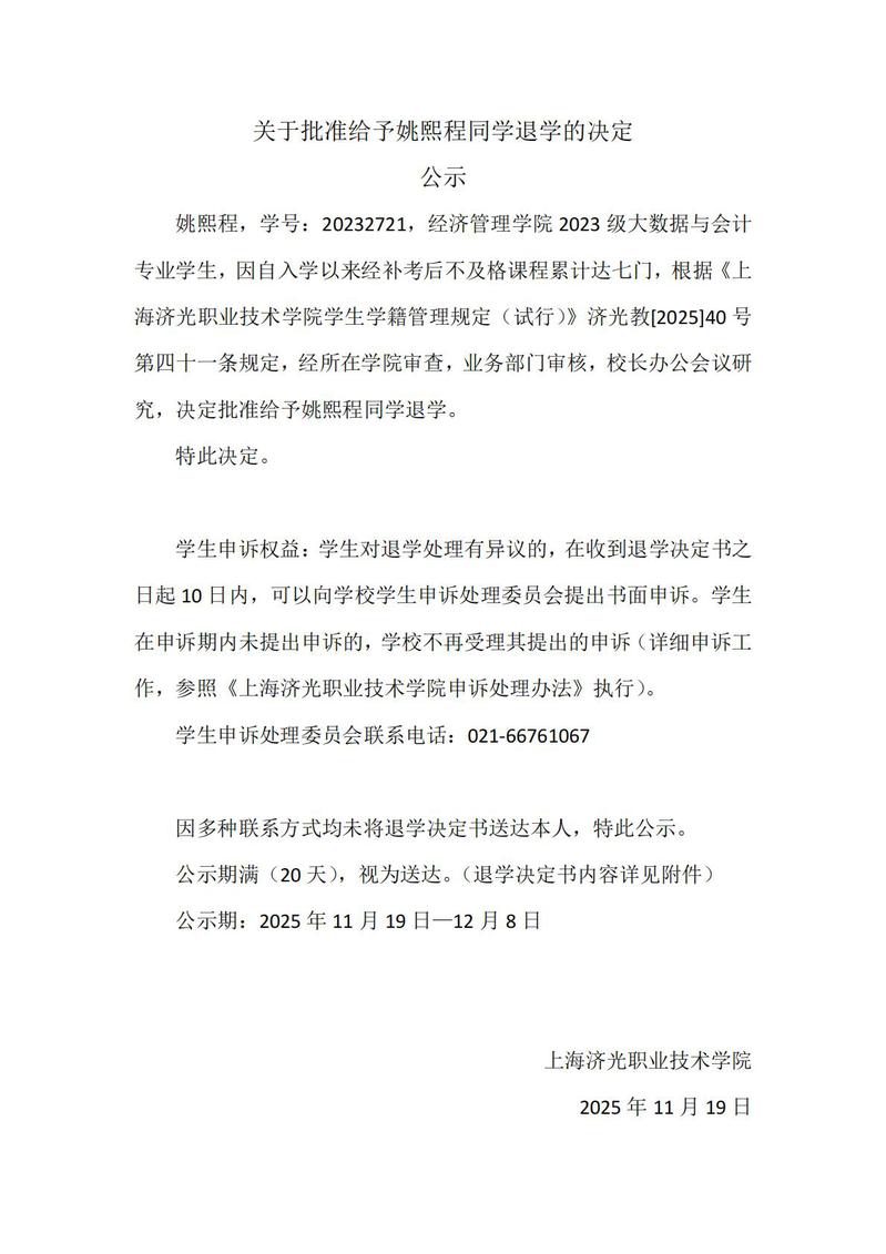关于批准给予姚熙程同学退学的决定公示