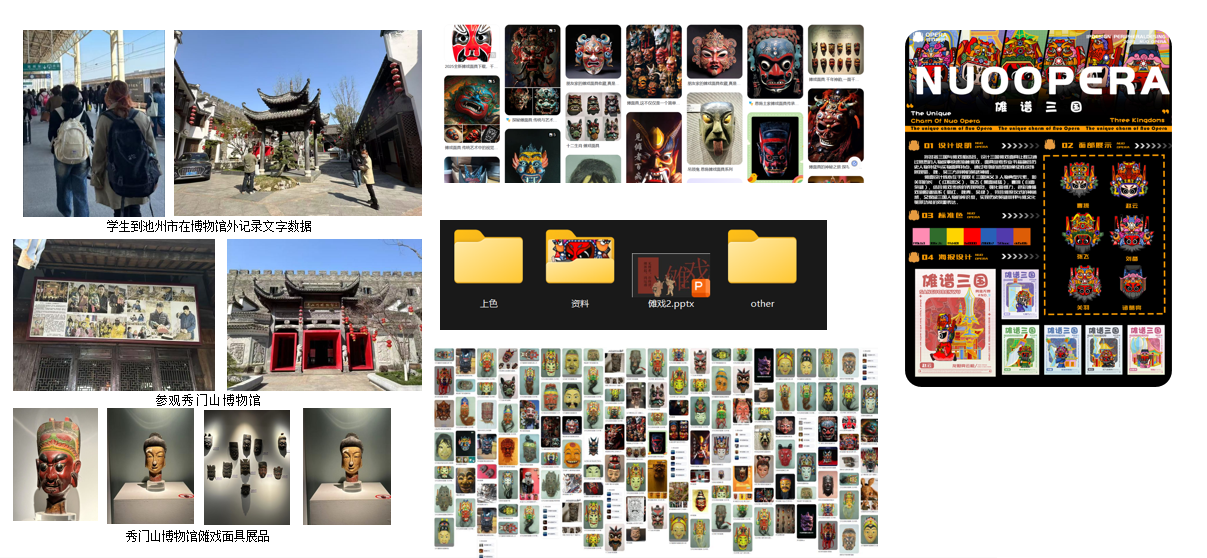 校内动漫《非遗动漫》课程团队深入当地调研,在传承人指导下采集实景照片,完整记录非遗特有工艺。学生作品《傩面三国》将传统傩面符号与三国故事结合,通过AIGC快速生成人物IP,并通过后期手工细节注入为角色赋予独特情感表达;作品 《山融海刻》在AIGC辅助下实现古老木雕艺术在数字叙事中焕发新生,成功推动传统技艺与现代审美的有机融合。