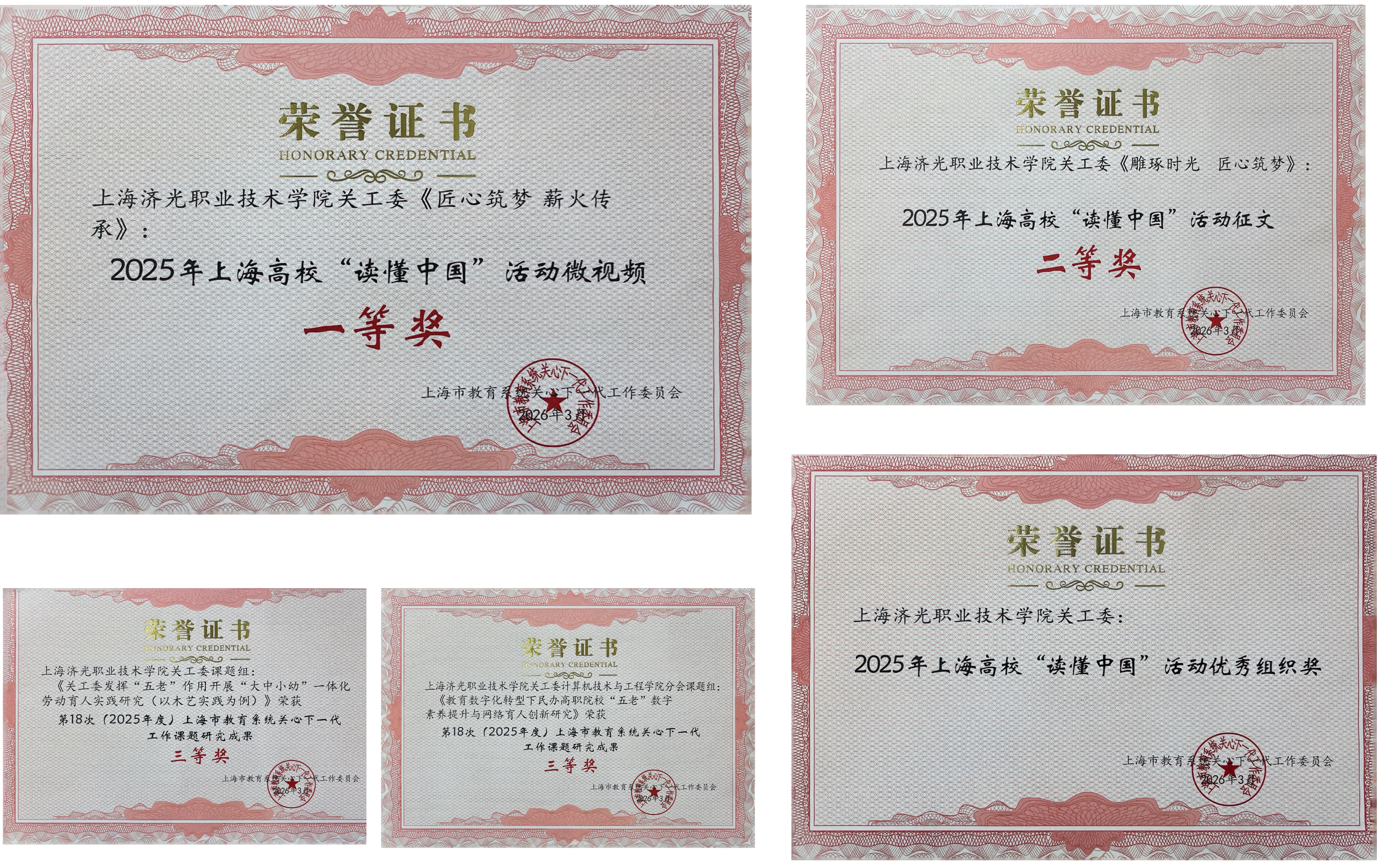 近日,上海市教育系统关心下一代工作委员会公布2025 年上海高校“读懂中国”活动评选结果,我校关工委荣获优秀组织奖,并在征文、微视频、课题研究三大类别中斩获多项荣誉,勇创佳绩。